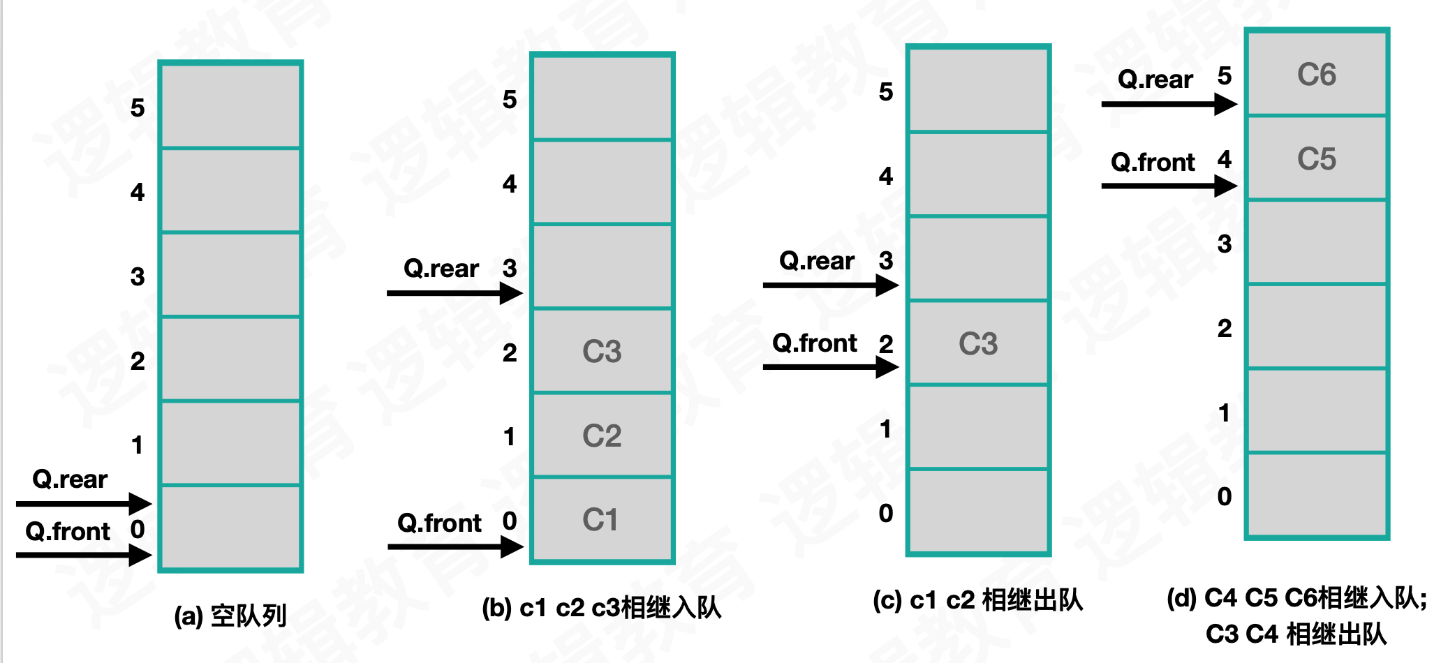 - a,b,c入队时,front不动,rear依次指向1,2,3 位置,最终指向3的位置