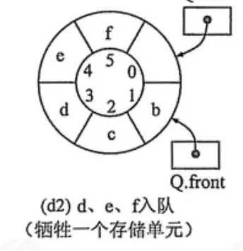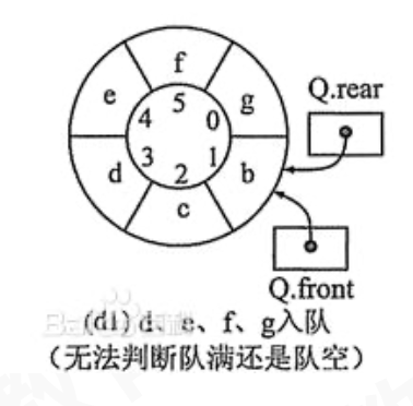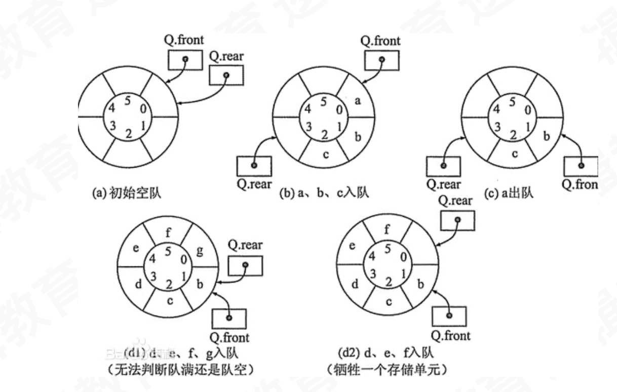 我们可以牺牲一个front前的存储单元,用来保持队尾和队首的距离,来解决最后一个问题:判断队满,(Q.rear+1) % Q.max == Q.front , 如果条件成立,意味着空的下一个位置就是队首front,此时队已满。