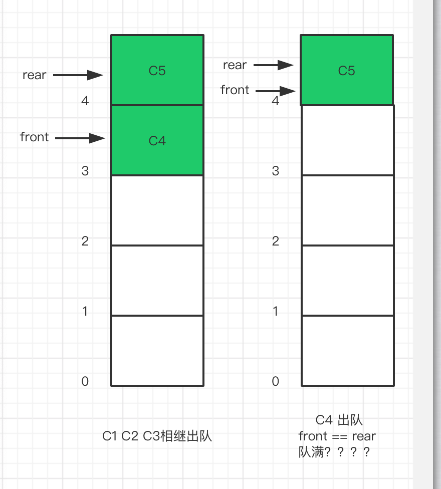 - 队满时,如下图,当front=rear,我们是无法判断是队满还是队空的, 但是我们已经用循环解决当只有最后一块存储单元有元素而不能再继续入队的问题。