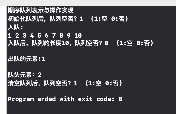 printf("顺序队列表示与操作实现\n");