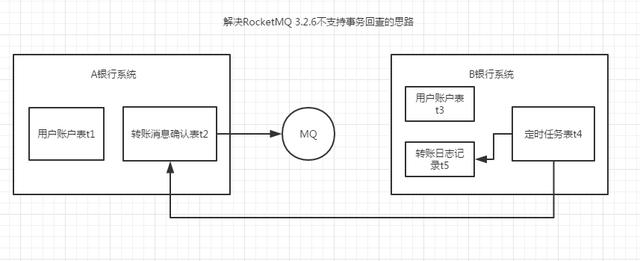 在正常情况下,当然没有问题,如果第五步(向MQ发送确认消息)出现失败,加上RocketMQ 3.2.6版本没有事务回查机制,就会导致这条转账消息,在A银行完成了操作,但是迟迟对B银行系统不可见!