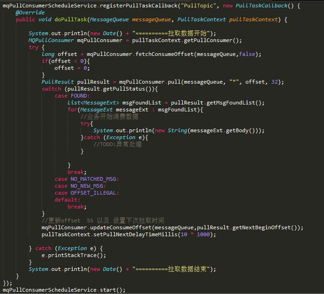 在Pull模式下,需要特别注意的是,本质上是从一个Topic下的所有Queue进行拉取,而且每个Queue都必须记录拉取位置,否则会导致重复消费。还有拉取的时间间隔,拉取的大小等等。不过所有的这一切,MQPullConsumerScheduleService都替我们考虑清楚了,提供updateConsumeOffset去更新消费的队列的位置(默认5S同步一次),提供setPullNextDelayTimeMillis设置下次拉取的时间间隔(应该设置的大一些,至少大于5S)。