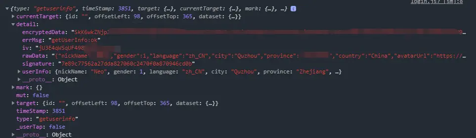 在这里我们可以获取到encrytedData和iv两个数据,注意这里的信息是加密的,想要获取到解密数据接着往下看