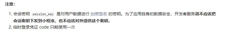 用户登录凭证(有效期五分钟)。开发者需要在开发者服务器后台调用 auth.code2Session,使用 code 换取 openid 和 session_key 等信息