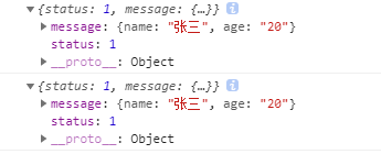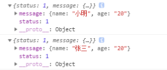 let obj={ status:1, message:{ name:'小明', age:'20' } } let obj1={...obj}; let mes={...obj1.message}; mes.name="张三"; obj1.message=mes; console.warn(obj) console.warn(obj1)打印结果: