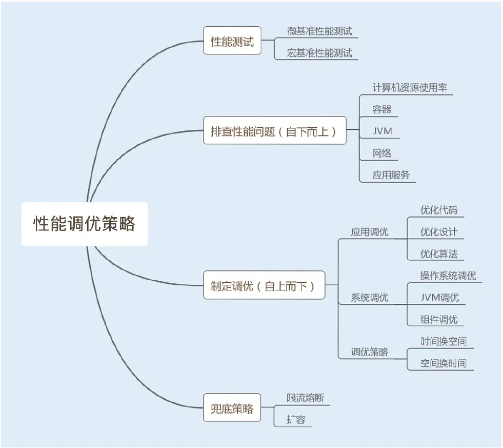 测试结果可以帮助我们制定性能调优策略,调优方法很多,这里就不一一赘述了。但有一个共同点就是,调优策略千变万化,但思路和核心都是一样的,都是从业务调优到编程调优,再到系统调优。