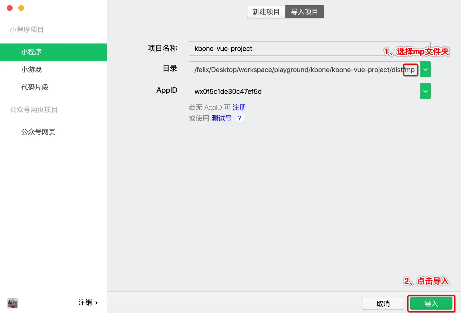 使用微信开发者工具导入项目根目录下 dist 目录下的项目 mp,直接选择 mp 文件夹即可,如下图所示: