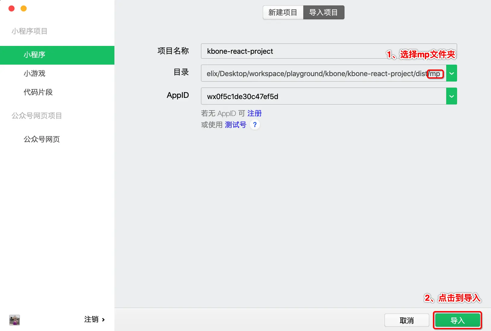 使用微信开发者工具导入项目根目录下 dist 目录下的项目 mp,直接选择 mp 文件夹即可,如下图所示: