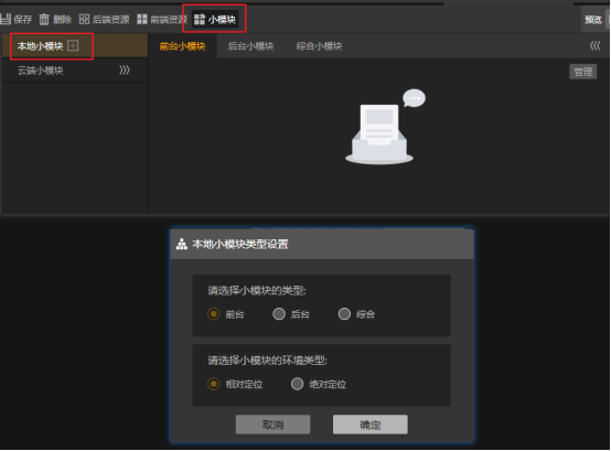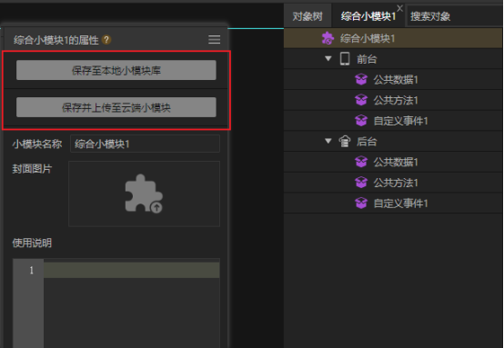 点击下图位置并选择小模块类型即可添加一个小模块,制作完成后可以就可以进行保存和上传,这样在其他案例中就可以从云端下载进行复用了。