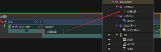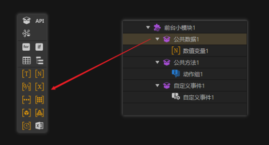 我们可以看到小模块内部除了我们要自定义添加的布局组件外还包含公共数据、公共方法和自定义事件三个部分,下面我们来分别说一下它们的使用方法。首先是公共数据,这里一般添加的是需要与外部交互的数据变量,我们通过小模块外的组件设置小模块属性的时候就是设置这些公共数据的值。同样,外部组件和变量也可以通过获取小模块的属性来的得到这些公共数据。
