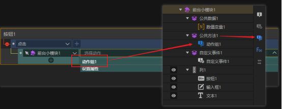 公共方法中我们一般添加动作组,也就是小模块内部在实现业务逻辑时执行的的动作,通过外部组件我们能够调用小模块执行公共方法中的某一动作组。