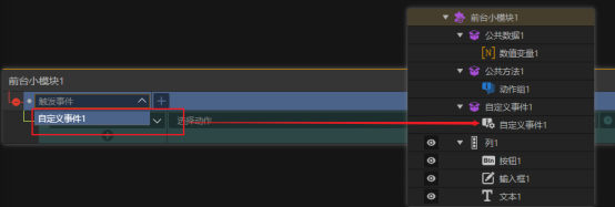 ivx中一般组件都会有触发事件,小模块也一样,不过需要我们去主动添加和设置,小模块的自定义事件触发后可以调用外部组件执行一些动作。总结一下就是外部组件和小模块通过公共数据进行数据传递,然后外部组件通过公共方法操作小模块,而小模块通过自定义事件来操作外部组件。