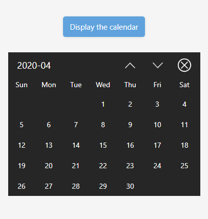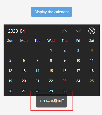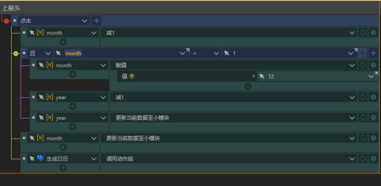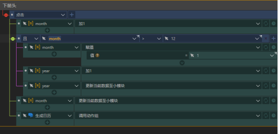 最后是月份切换和关闭日历的事件,点击关闭图标,我们重新让组件隐藏即可,因为这个都是小模块内部的组件所以不需要公共方法和事件直接执行即可,然后是切换月份,我们直接将month加减1然后更新数据到小模块,重新调用公共方法生成日历。