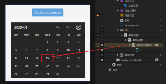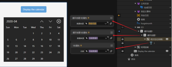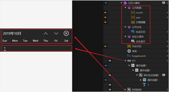 现在我们用小模块来实现一个日历模型。首先看一下布局,小模块的上半部分使用绝对定位容器做了一个操作行,展示了年份和月份,并且添加了翻看前一月和后一月日历以及关闭日历的按钮,下半部分是用循环创建制作了日历表。公共数据中添加了数值变量month、year,公共方法为生成日历,自定义事件为点击某天。