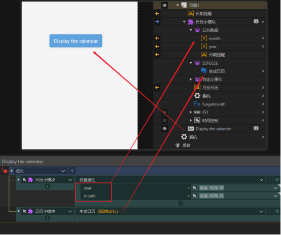 1.首先点击小模块外部的按钮组件,会将当前系统的年份和月份分别赋值给日历小模块公共数据中的year和month,然后让小模块执行公共方法生成日历。