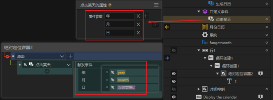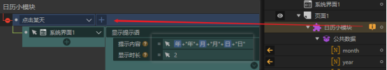 当点击某一日期时,会触发自定义事件点击某天,并将该日期的年月日赋值给事件的参数。这样,小模块就可以在触发事件中让外部组件执行一些动作,案例中我们让系统显示一个提示语,内容就是点击日期的年月日。
