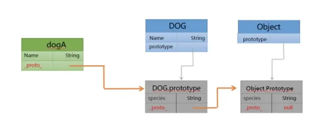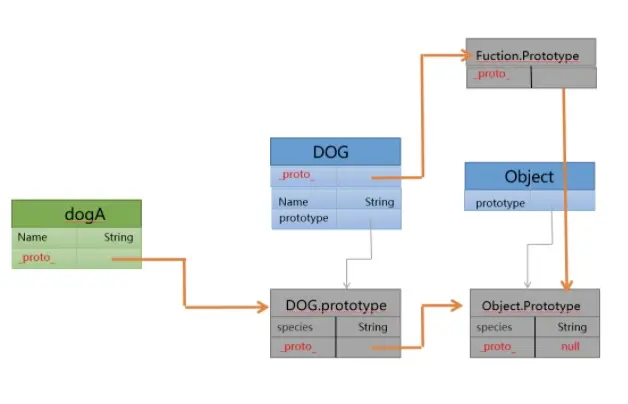首先,创建 new dogA()对象 生成_proto_指针指向其构造函数DOG的原型对象DOG.prototype,由于在js中函数也属于Object对象,它的原型是Object.prototype。最后Object是js原生底层对象,无原型对象,所以Object.prototype的_proto_指针指向的null,到这里原型链的最上层了。