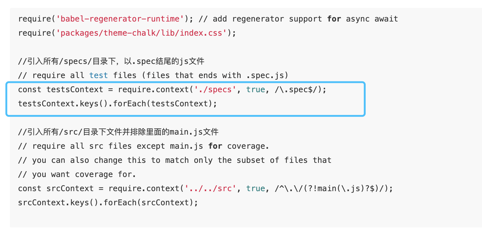 场景1 : 写测试文件时,需要index.js里面引入多个预先定义好spec文件夹下面,多个以.spec.js结尾的js文件, element UI test里面就是这么干的
