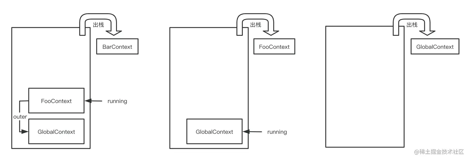 之后,完成bar和foo函数调用,会依次将上下文出栈,直至全局上下文出栈,程序结束运行。