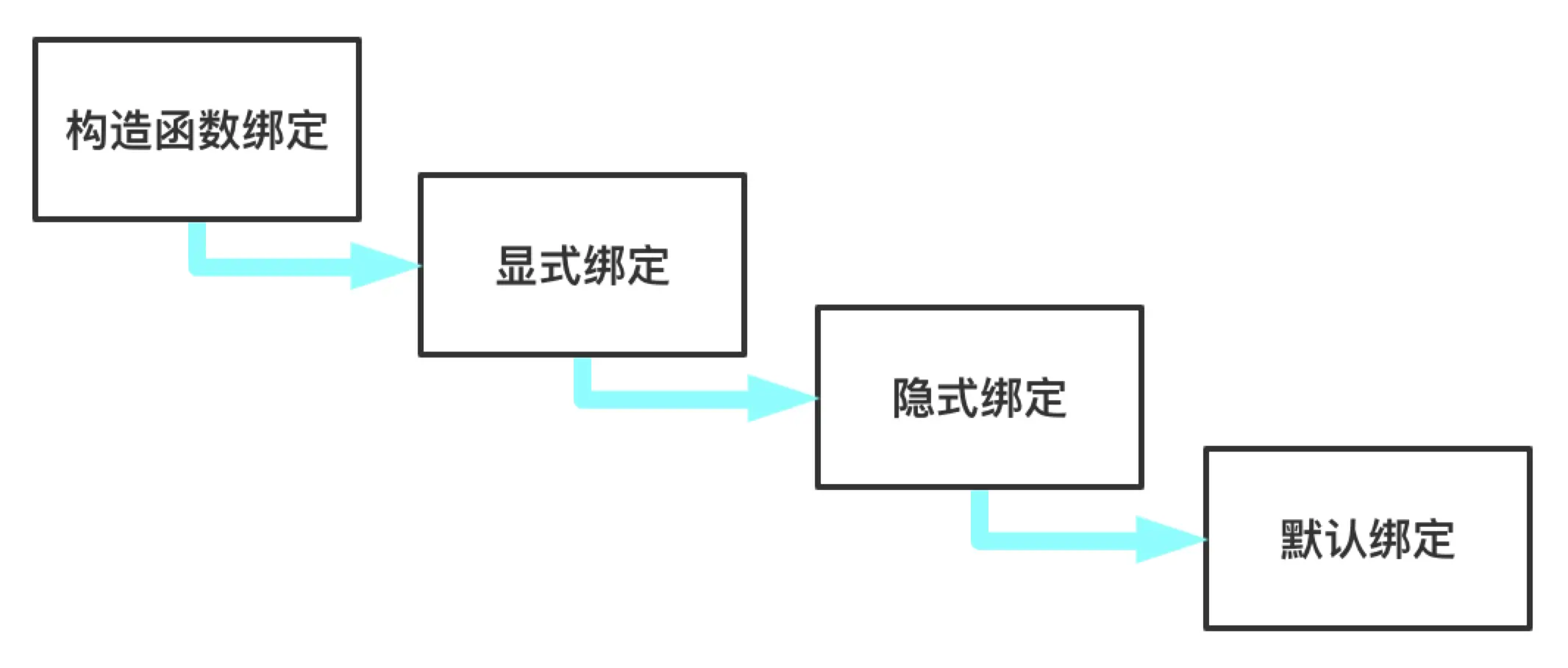 四条准则按照优先级排列,应该是:构造函数绑定 --> 显式绑定 --> 隐式绑定 --> 默认绑定
