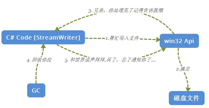 为什么能够写入文件? 那是因为我们的代码是请求windows底层的Win32 Api帮忙写入的,这就有意思了,因为这个场景有第三者介入,sw是引用类型受CLR管理,win32 api属于外部资源和.Net一点关系都没有,如果你在用完sw之后没有调用close方法的话,当某个时候GC回收了托管堆上的sw后,这给被打开的win32 api文件句柄再也没有人可以释放了,资源就泄露了,如果没看懂,我画张图: