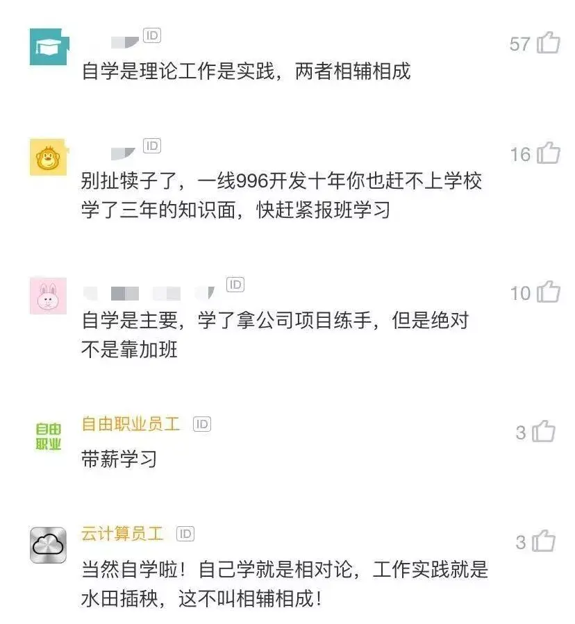 大多数人都认为自学比较重要,是理论基础,和工作实践相辅相成,学了知识拿公司项目练手,但绝不是靠加班!