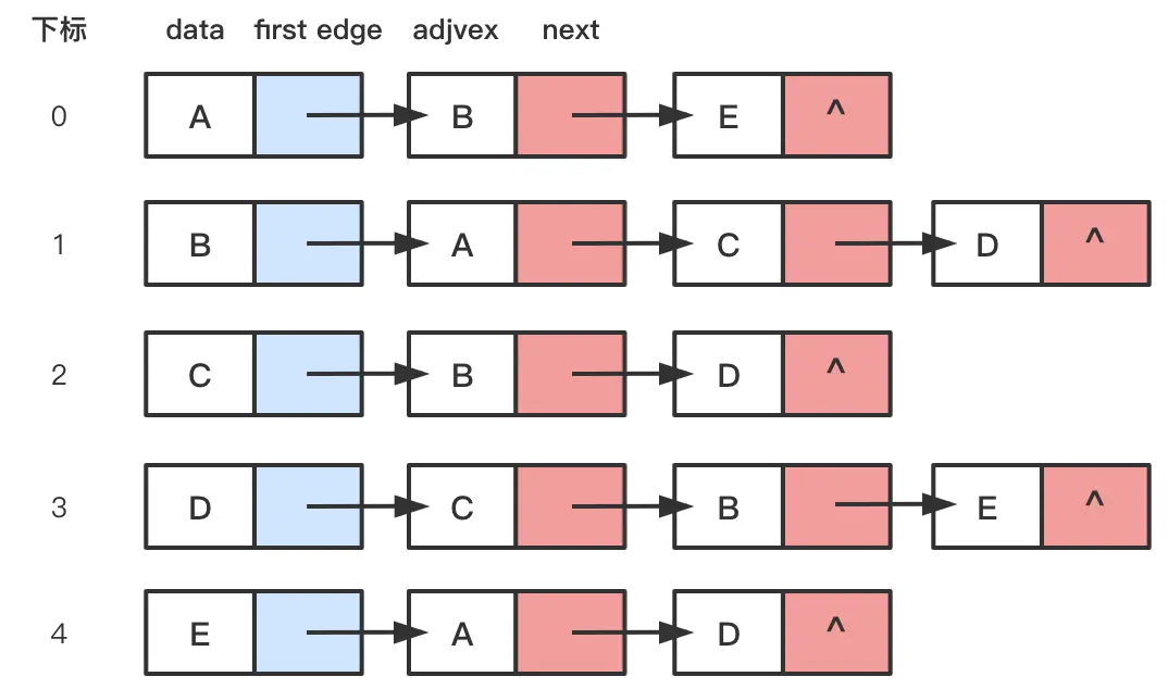 和顺序存储类似,需要有一个数组来存储图的各个顶点,不同的是,该数组里面的元素是类似链表的数据结构。