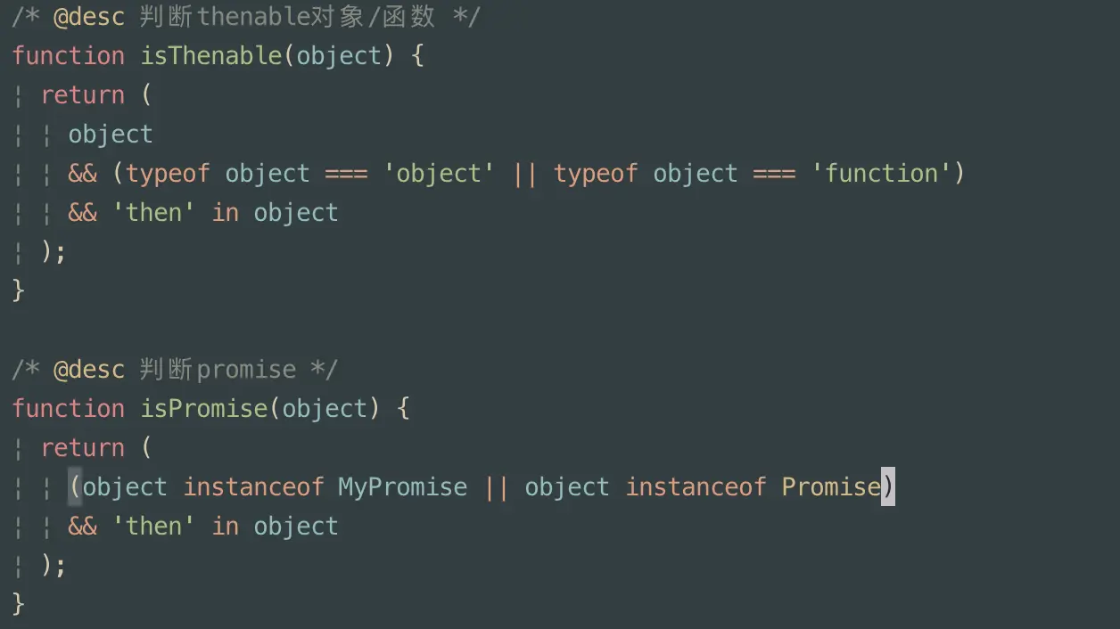 function delay() { return new Promise(resolve, setTimeout(() => resolve('success delay')), 1000); } new Promise((resolve, reject) => { resolve(delay()); reject('fail'); }); // 这会在1s后返回一个resolve状态的promise这是因为在我的实现中对状态的改变是后置的,即处理完所有的情况(promise, thenable...)后才改变,这样是不会阻塞reject执行的, 所以需要对resolve和reject加锁