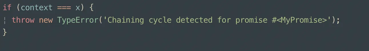 @param {Promise} context @param {*} x - Promise实例的值 function resolvePromise(context, x) { try { ... } catch(reason) { rejectPromise(context, reason) } }- 处理值是当前Promise实例