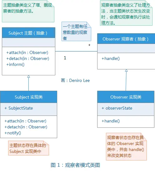- 观察者模式的关键对象是主题 Subject 和观察者 Observer;