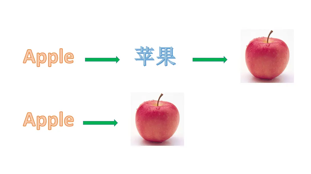 另外一个关键点在于摆脱语言思维定势,当你看到听到 Apple 时应该想到甜美的大苹果或者苹果电脑而不是先转换成 苹果 再思考。
