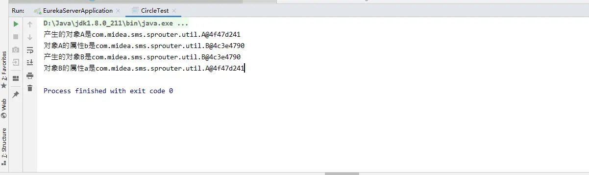 那让我们看看这代代码的运行结果吧,可以看到的是,A中的b就是我们new出的class B的一个对象,证明上面这段代码就是可以解决循环依赖的
