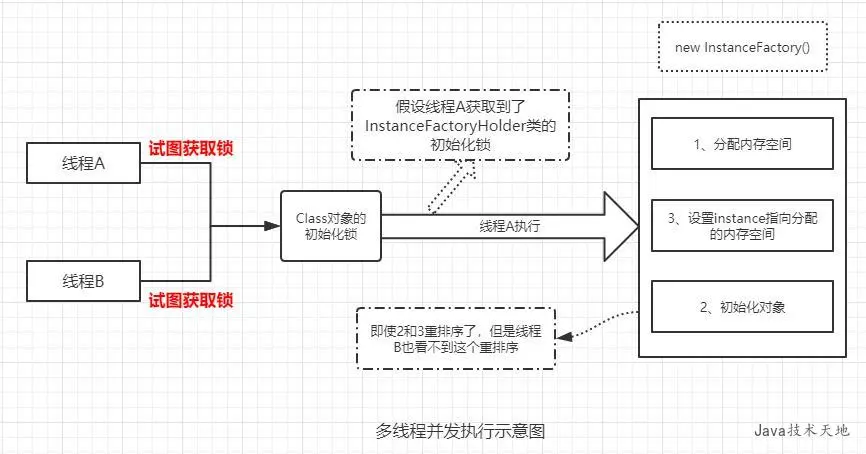 如果这时候有多个线程同时访问getInstance()方法,这是某一个线程会导致InstanceFactoryHolder类的初始化,因此最终只会有一个线程执行new InstanceFactory(),因此无论new InstanceFactory()中是否存在排序,它对其它的线程不可见。其执行流程如下图所示: