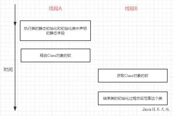 Java语言规范规定,对于每个类或者接口C,都有唯一的初始化锁LC与之对应。从C到LC的映射,由JVM具体实现去自由实现。JVM在类初始化期间会获取这个初始化锁,并且每个线程至少获取一次锁来保证这类已经被初始化过了。初始化C的过程如下: