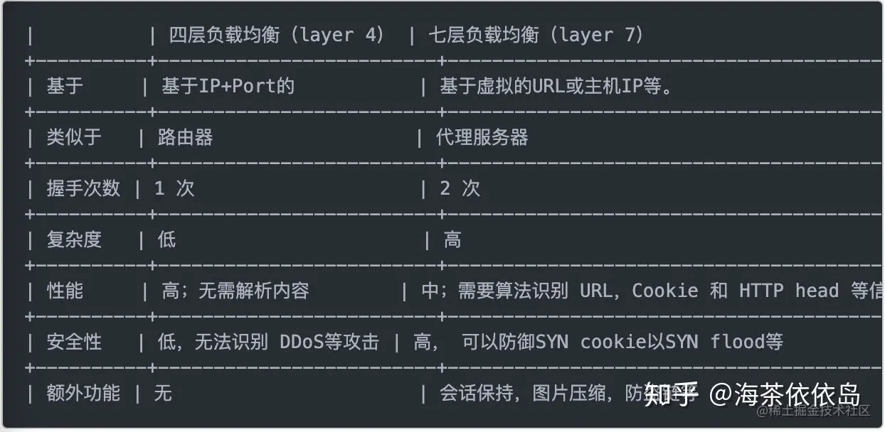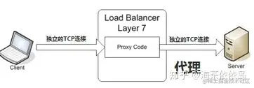 以常见的 TCP 为例,负载均衡设备如果要根据真正的应用层内容再选择服务器,只能先代理最终的服务器和客户端建立连接(三次握手)后,才可能接受到客户端发送的真正应用层内容的报文,然后再根据该报文中的特定字段,再加上负载均衡设备设置的服务器选择方式,决定最终选择的内部服务器。负载均衡设备在这种情况下,更类似于一个代理服务器。负载均衡和前端的客户端以及后端的服务器会分别建立 TCP 连接。所以从这个技术原理上来看,七层负载均衡明显的对负载均衡设备的要求更高,处理七层的能力也必然会低于四层模式的部署方式