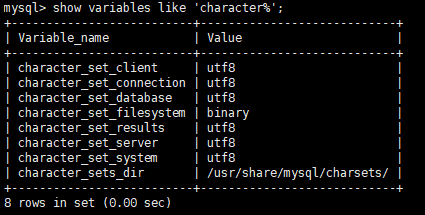 # character_set_client:客户端请求数据的字符集# character_set_connection:从客户端接收到数据,然后传输的字符集# character_set_database:默认数据库的字符集# character_set_filesystem:把操作系统上文件名转化成此字符集,默认binary即可# character_set_results:结果集的字符集# character_set_server:数据库服务器的默认字符集# character_set_system:这个值总是utf8,不需要设置,存储系统元数据的字符集