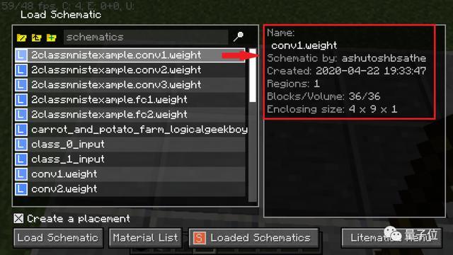 在这一步后,你会获得一组示意图文件,后缀名为.litematica。文件的名称和你命名的网络层相同,比如conv1.weight.litematica、fc2.weight.litematica等等。将相应文件导入即可。