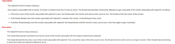 JVM采用monitorenter、monitorexit两个指令来实现同步。 查询JVM规范The Java® Virtual Machine Specification[1]中关于monitorenter和monitorexit的介绍: