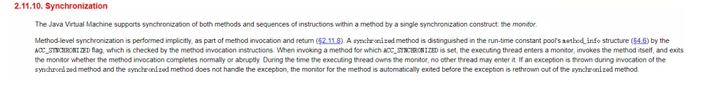 JVM采用ACC_synchronized标记符来实现同步。 查询JVM规范The Java® Virtual Machine Specification[2]中关于方法级同步的介绍: