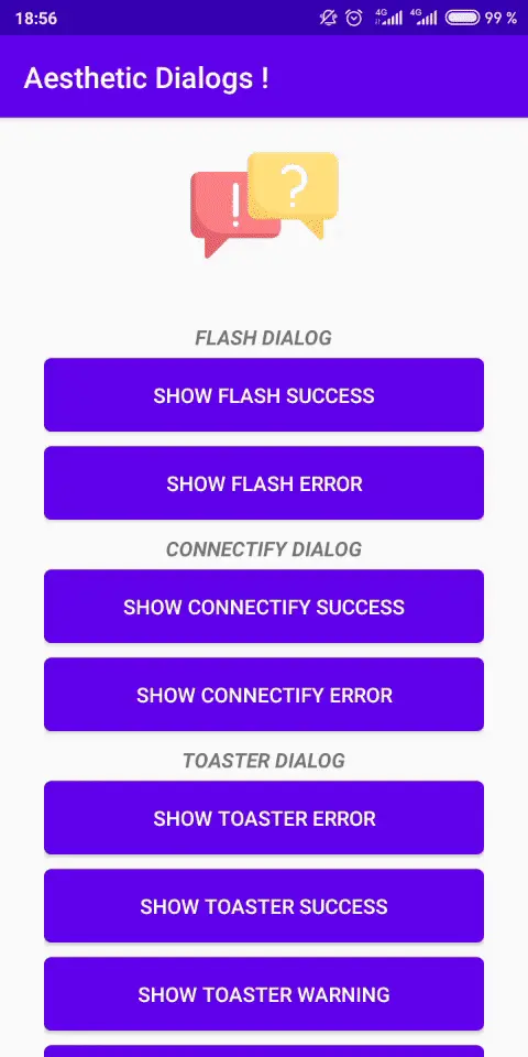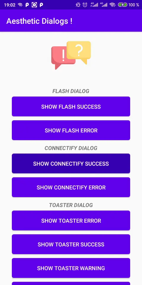 AestheticDialog.showFlashDialog(this, "Your dialog Title", "Your message", AestheticDialog.ERROR);Connectify:
