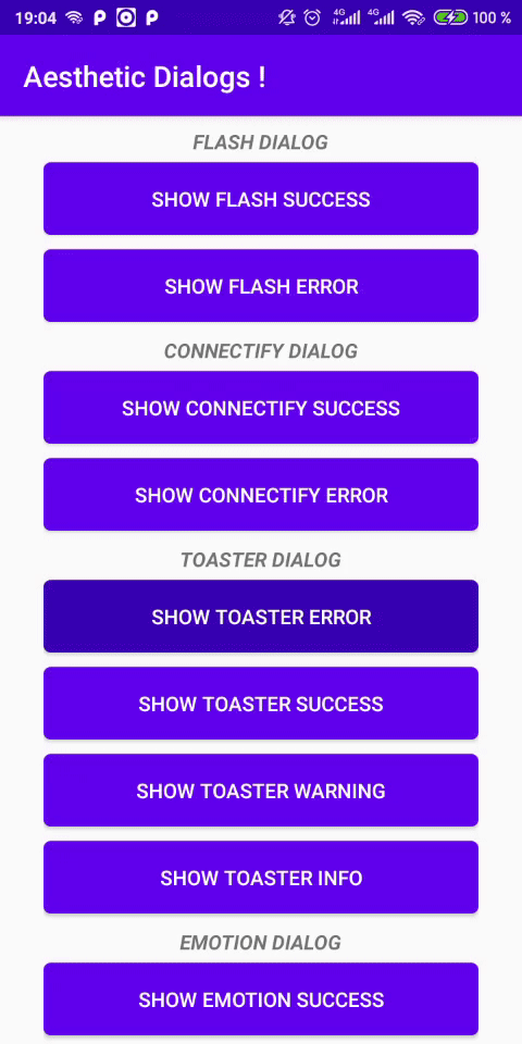 AestheticDialog.showConnectifyDark(this, "Your message", AestheticDialog.ERROR);Toaster:
