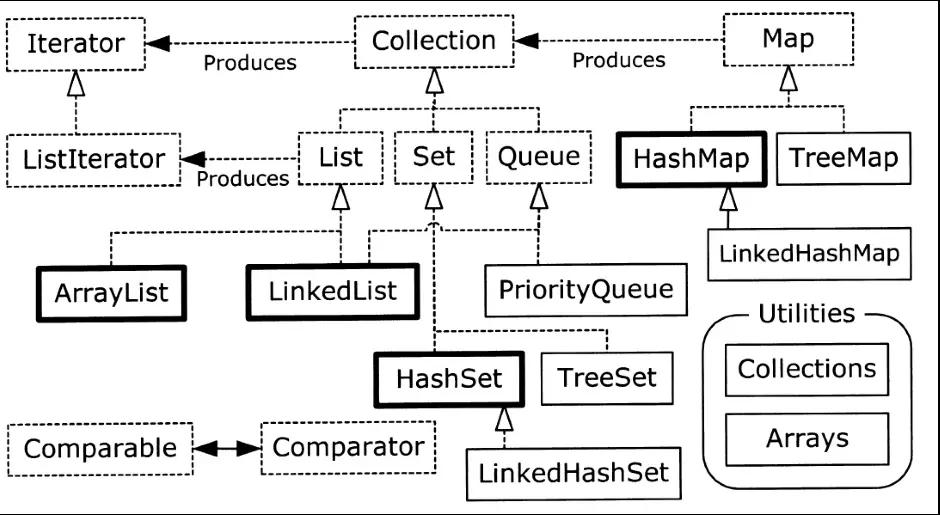 上图是集合框架的一个简图。矩形虚线表示接口(interface),矩形实线表示类。空心箭头的虚线表示类或接口的实现。例如,类ArrayList实现了List接口,List接口实现了Collection接口。实心箭头的虚线表示某个类的对象可以生成箭头所指向的类的对象。例如,任意的Map对象可以生成Collection对象,任意的Collection对象可以生成Iterator对象。右下脚圆角矩形中的是工具类:Collections(工具类) 和 Arrays(数组类)。加粗的黑框所表示的类:ArrayList、LinkedList、HashSet、HashMap是使用频率比较高的几个类。
