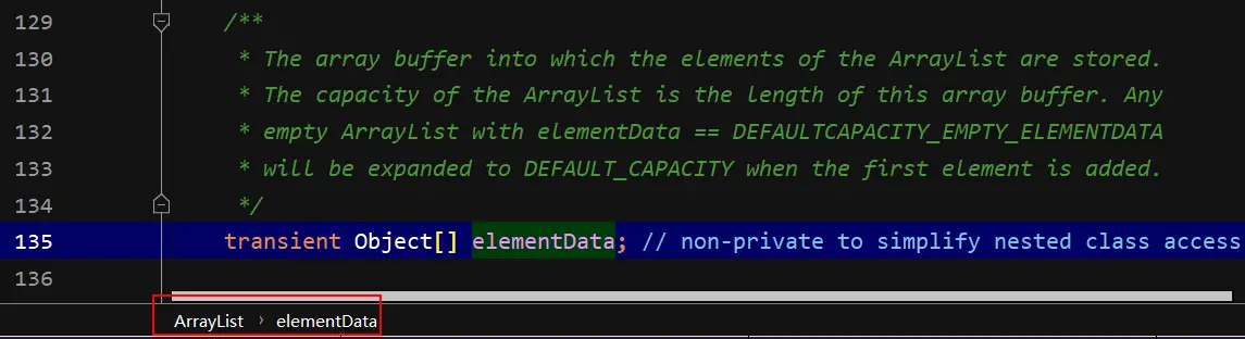 ArrayList的底层数据结构是数组[2]。类中的Object类型的数组成员变量elementData保存指定类型的数组元素。