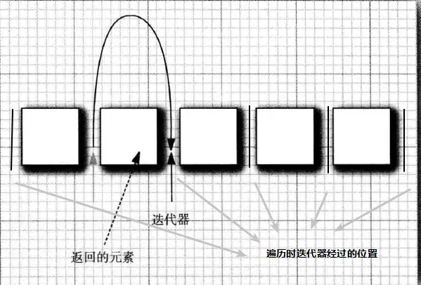 值得注意的是迭代器的位置,Java迭代器应该是位于两个元素之间的位置,当调用next时,迭代器就越过下一个元素,并返回刚刚越过的那个元素的引用[3].