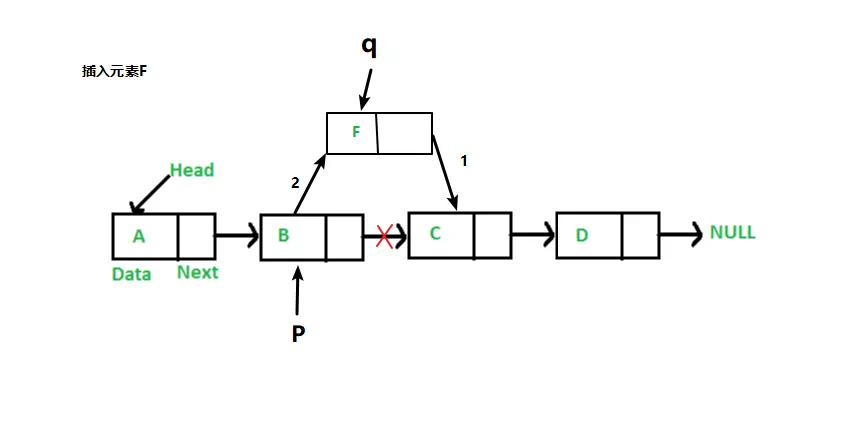 在中间新增元素时,首先找到要插入元素的前一个节点,然后将新增节点F的next指向C节点,最后将B的next指向F。具体的实现代码如下:
