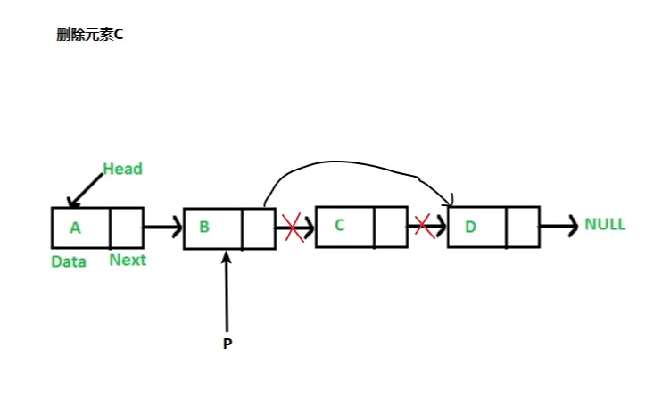 删除元素时,首先找到待删除元素的前一个节点,然后将其next指向下下个节点,具体代码如下: