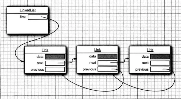 上图提到的链表都是单链表,在java中所有的链表实际上都是双向链接的(doubly linked),每个节点除了保存后一个节点的引用外,还保存前一个节点的引用。见下图: