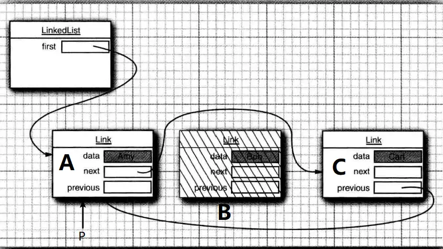 删除过程如下图,先将A元素的next指向C元素,再将C元素的previous指向A元素