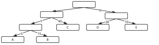 - 先把有权值的叶子节点按照从小到大的顺序排列, 即: A5 E10 B15 D30 C40