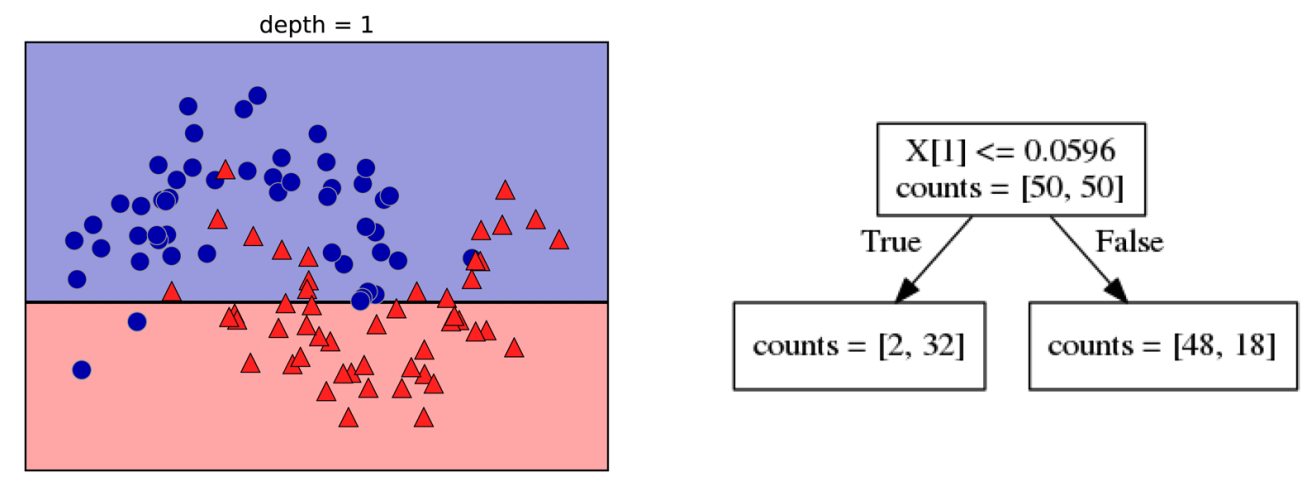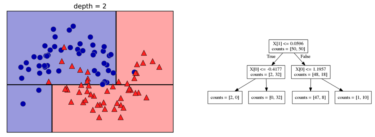 需要注意的是,决策树会对每个case都进行判断,容易导致过拟合。避免过拟合的方法有前处理(pre-pruning)和后处理(post-pruning)两种。前处理是一开始就指定树的最大深度,后处理是先生成完全的树,然后再进行剪枝,将不重要的特征合并至其父枝。scikit-learn里面采用的是前处理。